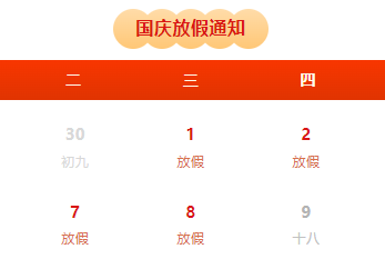 国庆放假通知日一二三四五六28上班29初八30初九1放假2放假3放假4放假5放假6放假7放假8放假9十八10十九11上班放假时间10月1日(周三)至8日(周三)放假调休,共8天。9月28日(周日)、1...